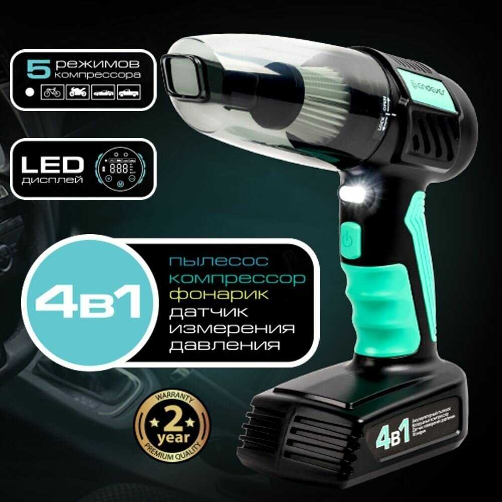 Так в вообщем какая-та детская игрушка прям толька велосипеды и мячики накачивать, фонарик слабый ели видно, аккумулятор надолго не хватает, короткий шнур давления, пылесос чисто стото мелкое не крупное собрать, короче не берите за такие деньги - 1