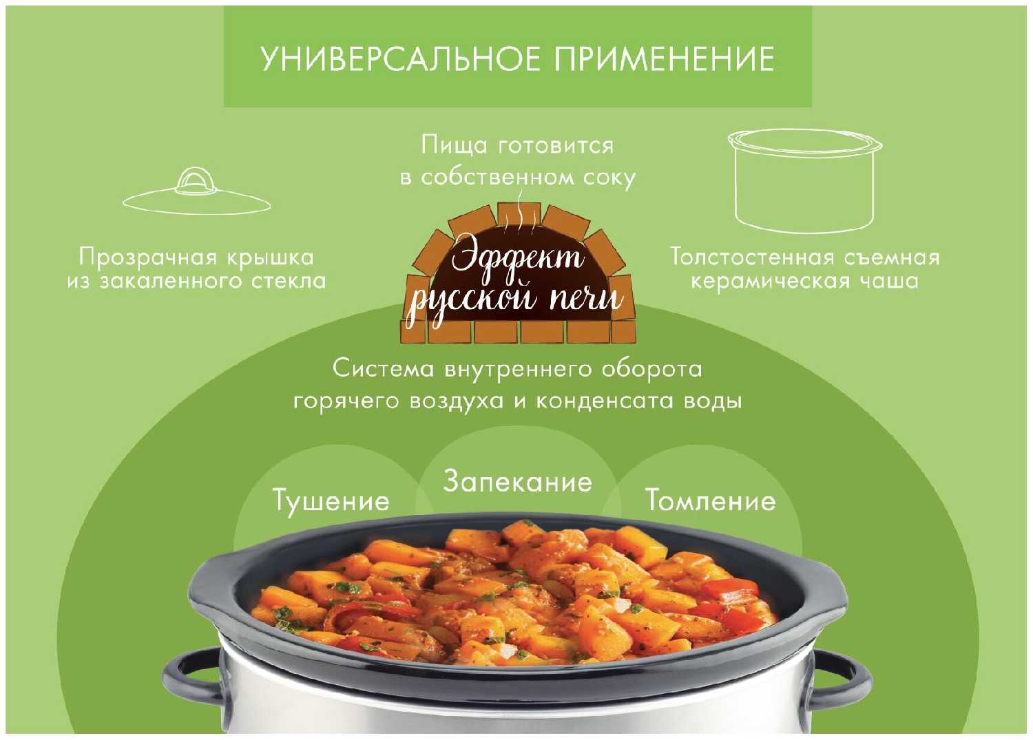 Позиционируется как медленноварка с эффектом русской печи.Ничто не заменит русскую печь! Можно пользоваться когда время девать некуда