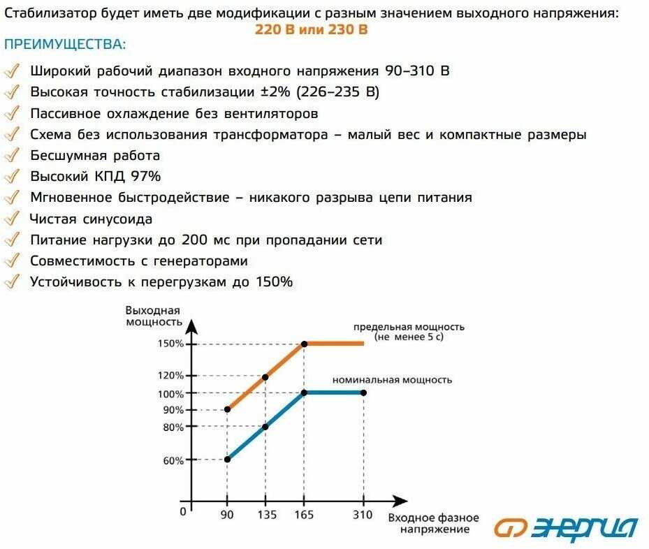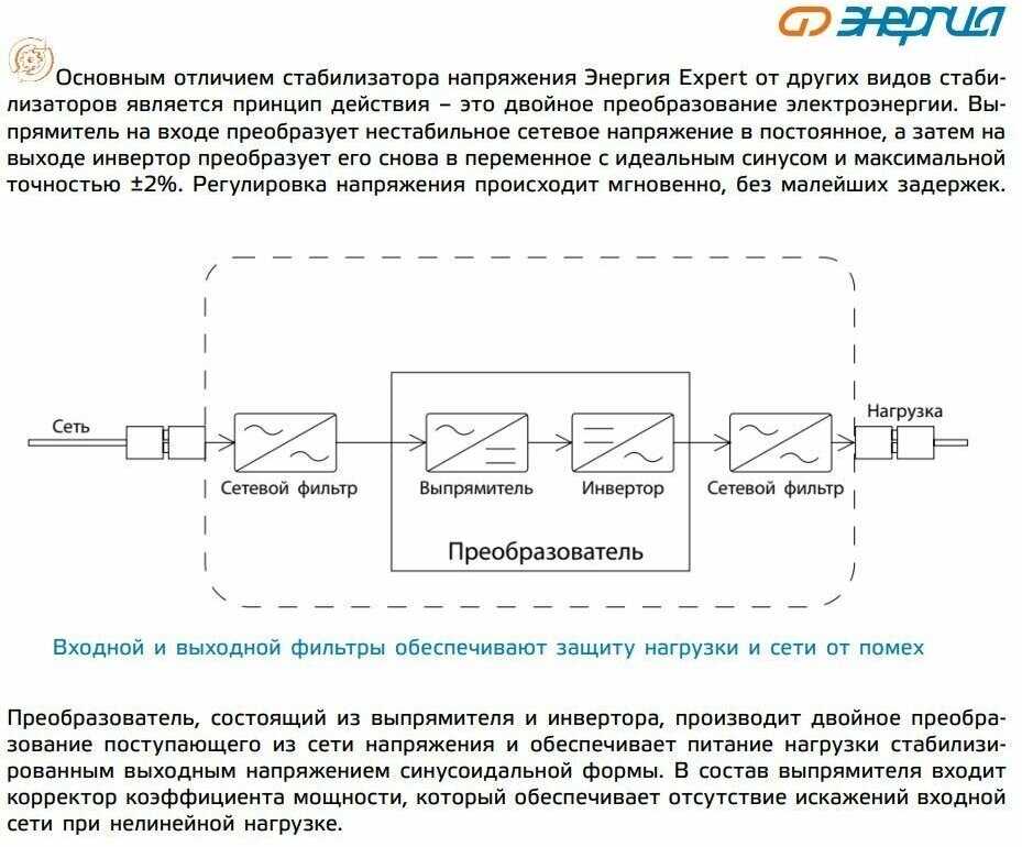 Очень прост для потребителя, нет даже индикации напряжения, что считаю достоинством. Работает совершенно бесшумно. Гораздо дешевле аналогичных устройств других производителей + еще скидка на сайте фирмы Вольтмаркет в 10% на товары бренда Энергия. Подключен к старой (двухпроводной) сети для котла Baxi - - На сайте указана гарантия 3 года, по факту в инструкции по эксплуатации только 12 месяцев