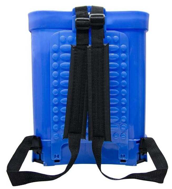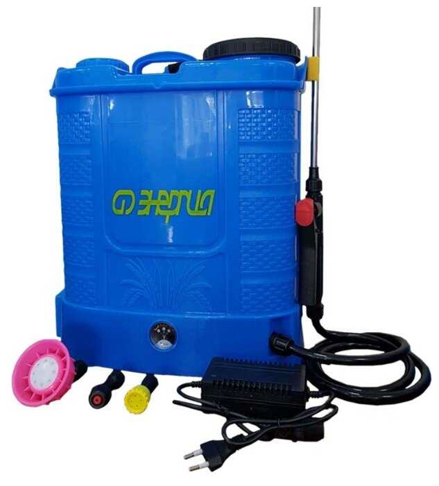 обычный опрыскиватель большой емкости. на синем корпусе из коробки были несколько белых пятнышек, возможно, от каких-то ударов, скажется как-то на прочности корпуса покажет время. на корпусе есть секция для хранения насадок -удобно.