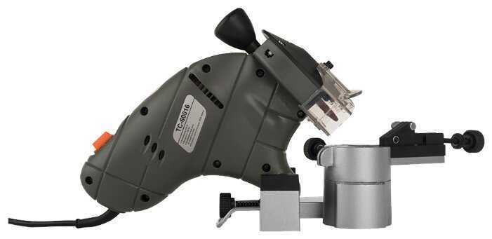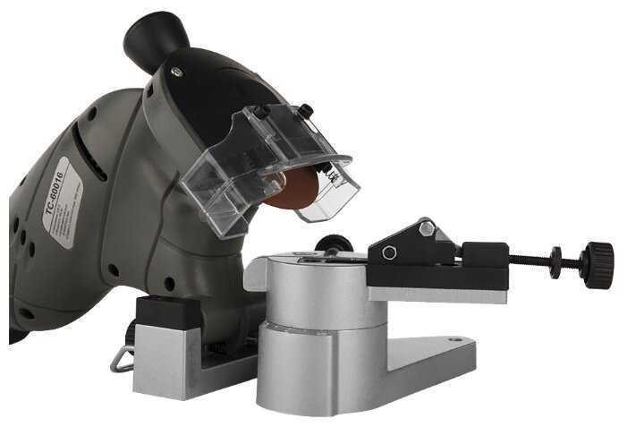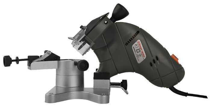 Алюминиевая станина, быстрота сборки и разборки(убираю в коробку после заточки) точит мягко мощности хватает с учётом того что бы не пожечь зуб цепи. меня устраивает.