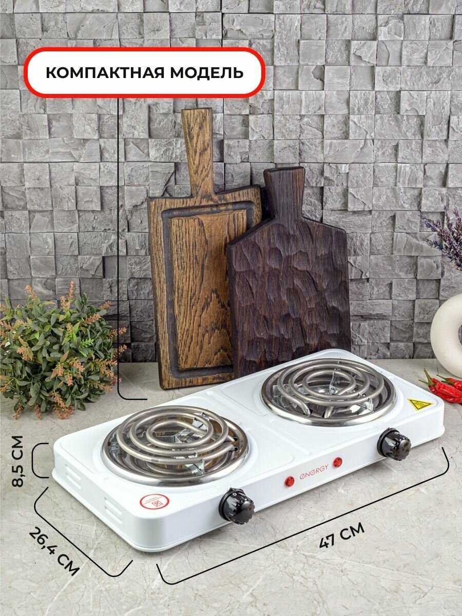 Суммарная мощность 2000 Вт (по 1000 Вт на конфорку) обеспечивает быстрый нагрев, но создаёт нагрузку на электросеть. Компактные габариты (обычно 28x32x6 см) экономят пространство, но ограничивают размер посуды. Отсутствие защитного экрана упрощает конструкцию, но повышает риск ожогов — располагать плиту нужно вдали от детей.