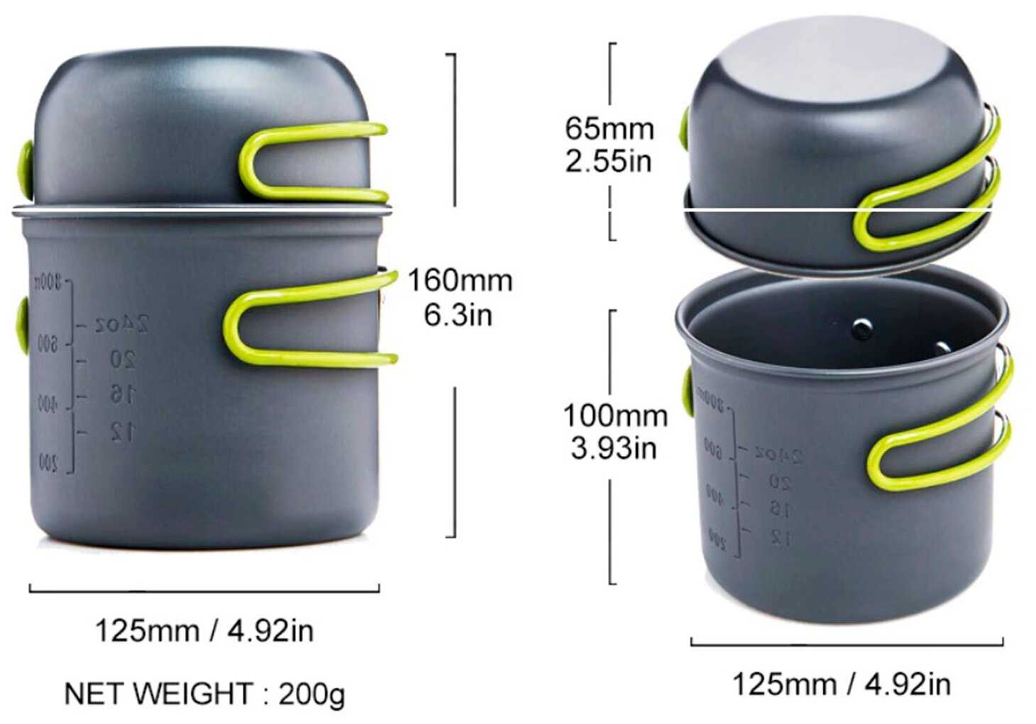 Дополнительная информация : | подробная комплектация: Кастрюля 1 л - 1 шт. кастрюля 05 л - 1 шт. вилка - 1 шт ложка - 1 шт. нож - 1 шт. чехол для приборов - 1шт. чехол сетка для набора - 1 шт., особенности: эмалированное покрытие армейская складная конструкция |