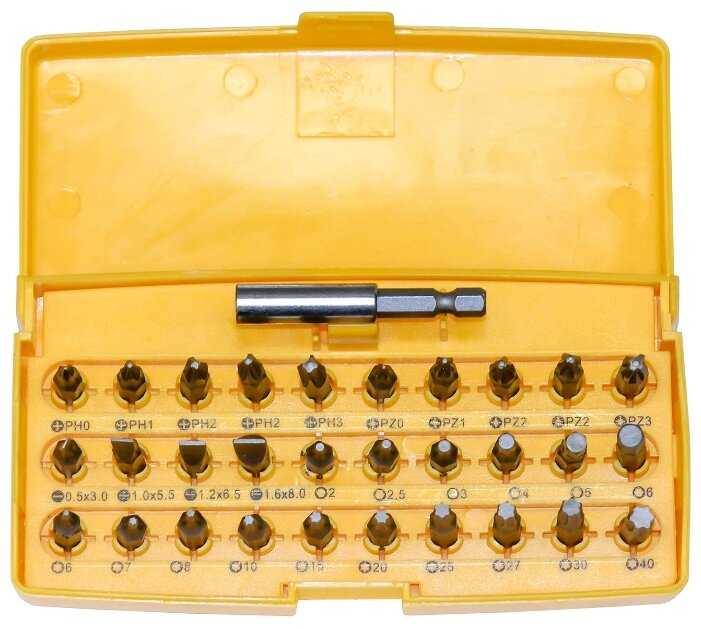 Биты подробно : | SL 05х30, 10х55, 12х65, 16х80, PH0, PH1, PH2 - 2 шт., PH3, PZ0, PZ1, PZ2 - 2 шт., PZ3, Torx 6, 7, 8, 10, 15, 20, 25, 27, 30, 40, Hex 2, 3, 4, 5, 6 |