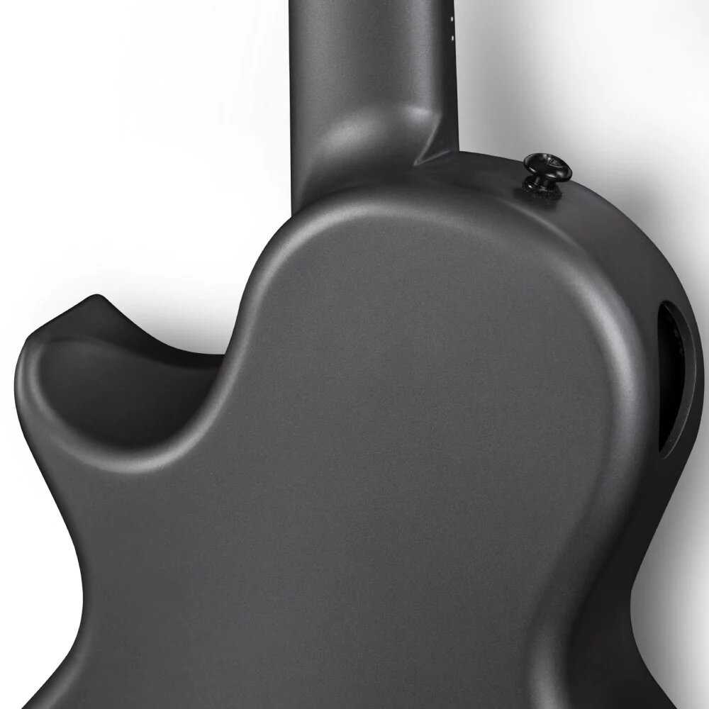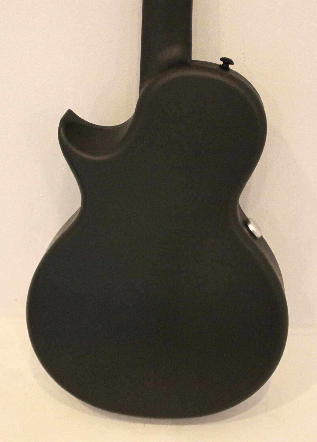 Гитара сделана из пластика, приятного на ощупь. Отпечатки не собирает. Цвет ближе к графитовому. Ремня в комплекте не было.