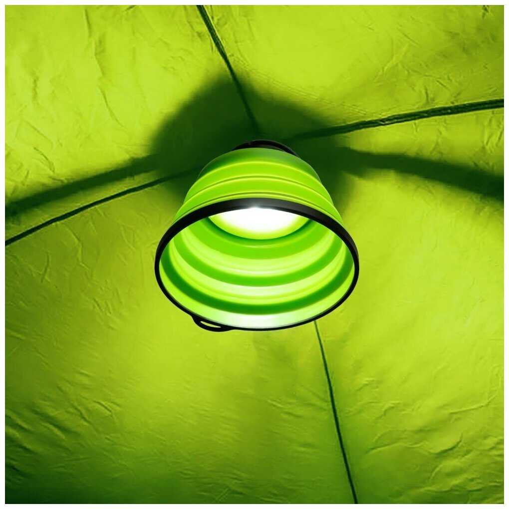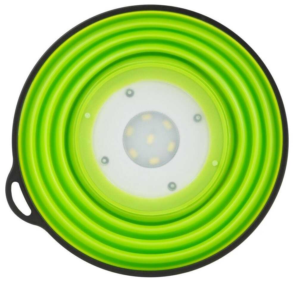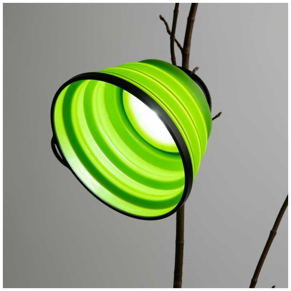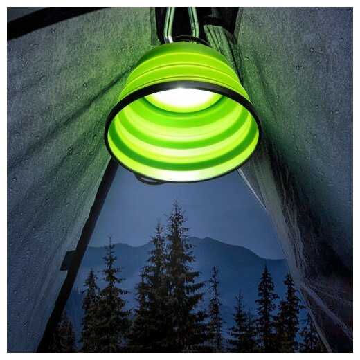 Мягкий зеленый свет который можно регулировать высотой силиконовой мембраны (если, например фонарь лежит на лежит поверхности, если же видит, то пятно света можно регулировать также. Свет достаточно яркий, изделие тактильно приятно, есть за что подвесить.