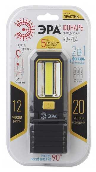 | Дополнительная информация : | два магнита крючок, тип батарей: AAA, подробная комплектация: Фонарь ЭРА RB-704 Практик 5Вт COB 3xLED 3xAAA пластик резина желтый, количество батарей: 3, количество режимов работы: 2 |