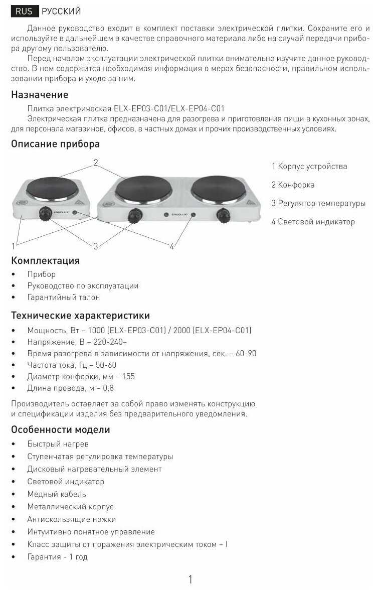 Число электрических конфорок : | есть |