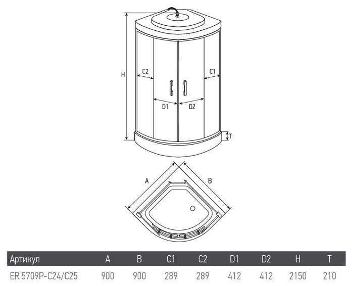 Характеристи ERLIT Eclipse ER 5709P средний поддон 90см*90см