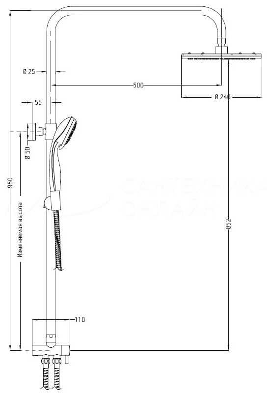 | Дополнительная информация : | высота стойки для душа: 995 мм, диаметр душевой лейки: 110 мм, диаметр верхнего душа: 250 мм |