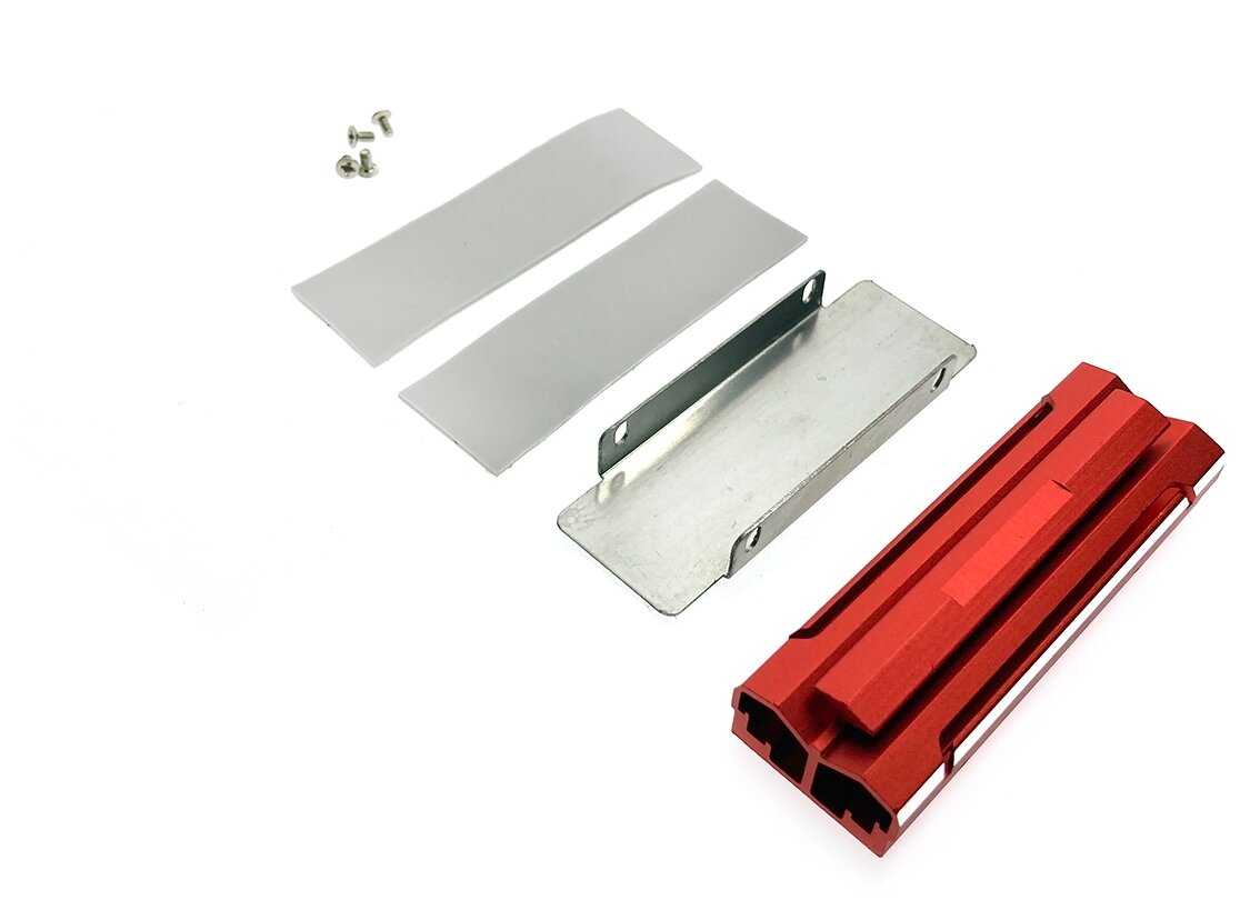 Недостаточный диапазон смещения отверстий крепежа. Надо растачивать отверстия. Неэффективная форма. В угоду дизайна выбрана неправильная форма. При том же объёме многорёберный радиатор имеет боьшую эффективность. Дополняю. Допиливал 2 часа. Растачивал отверстия. Снимал напильником торец П-образной нижней пластины. Под второй подкладывал шайбы. Так приходится подгонять под накопитель с односторонним расположением чипов.