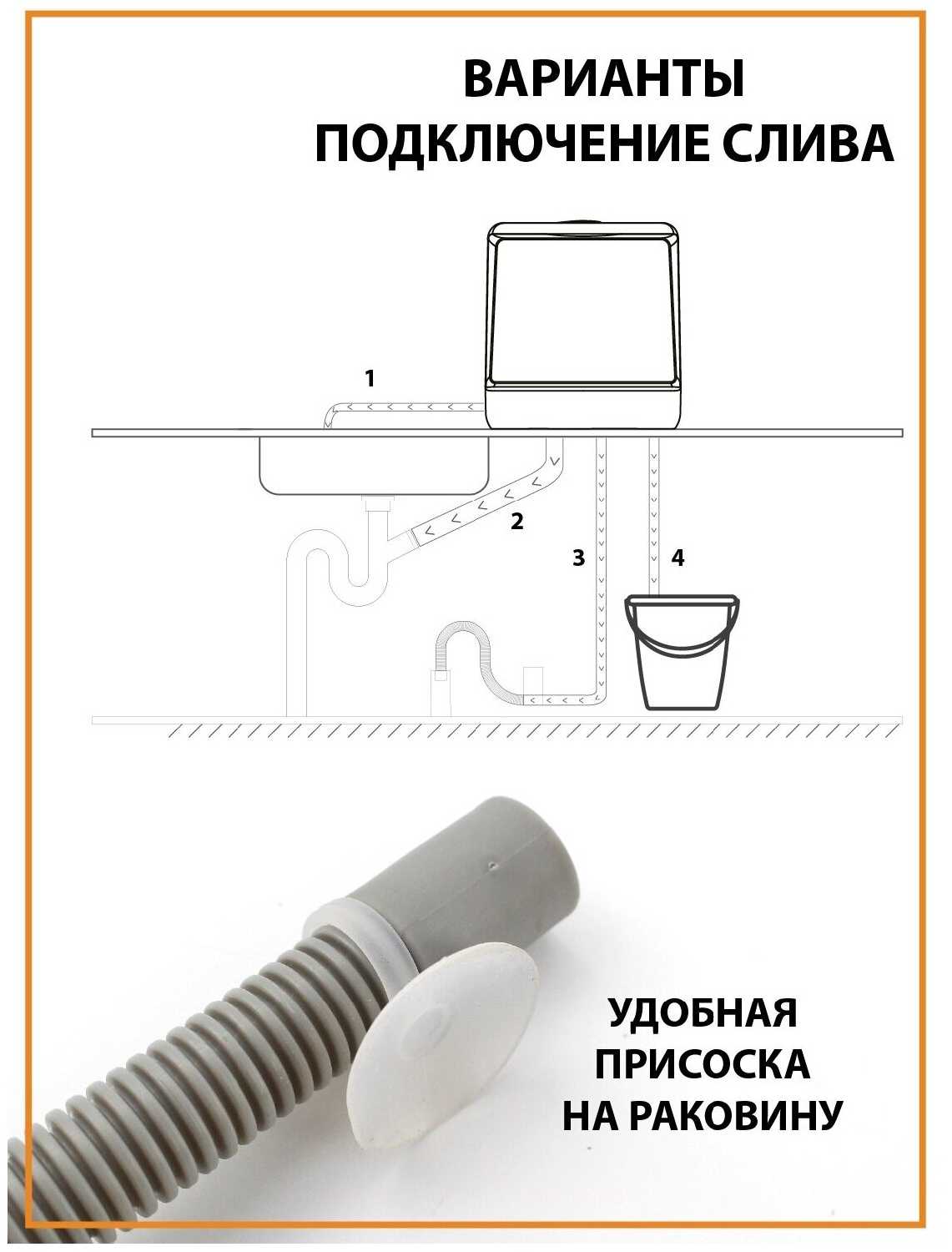 - Сливной шланг можно напрямую опускать в раковину, что избавляет от необходимости организации стационарного слива в канализацию.