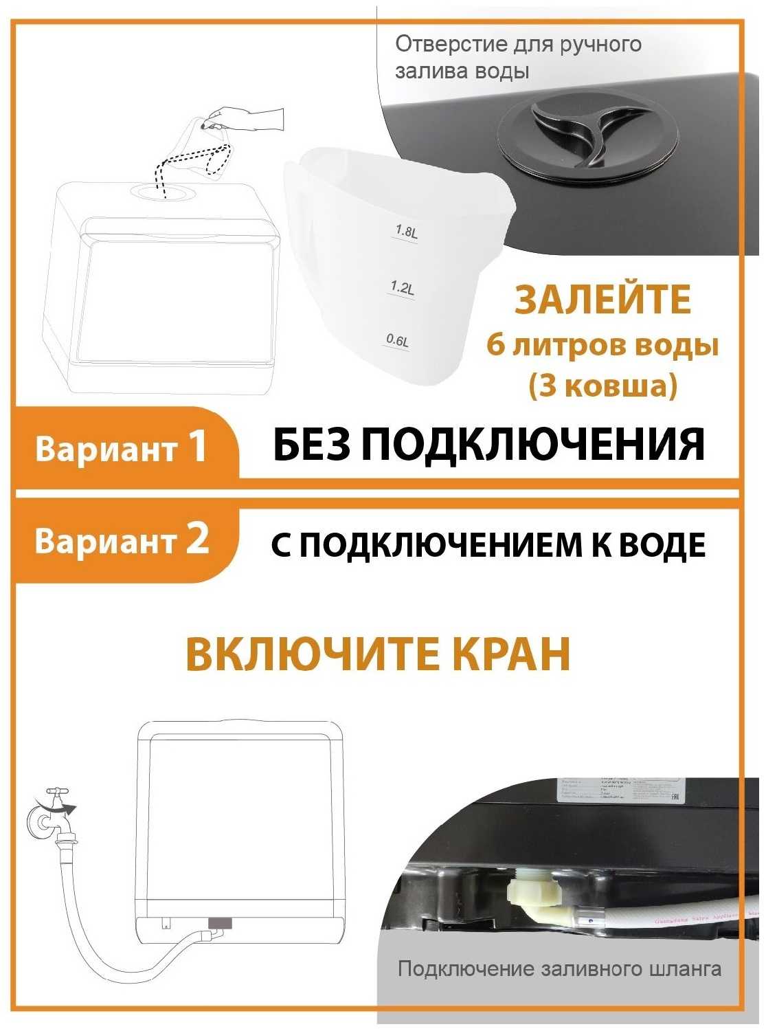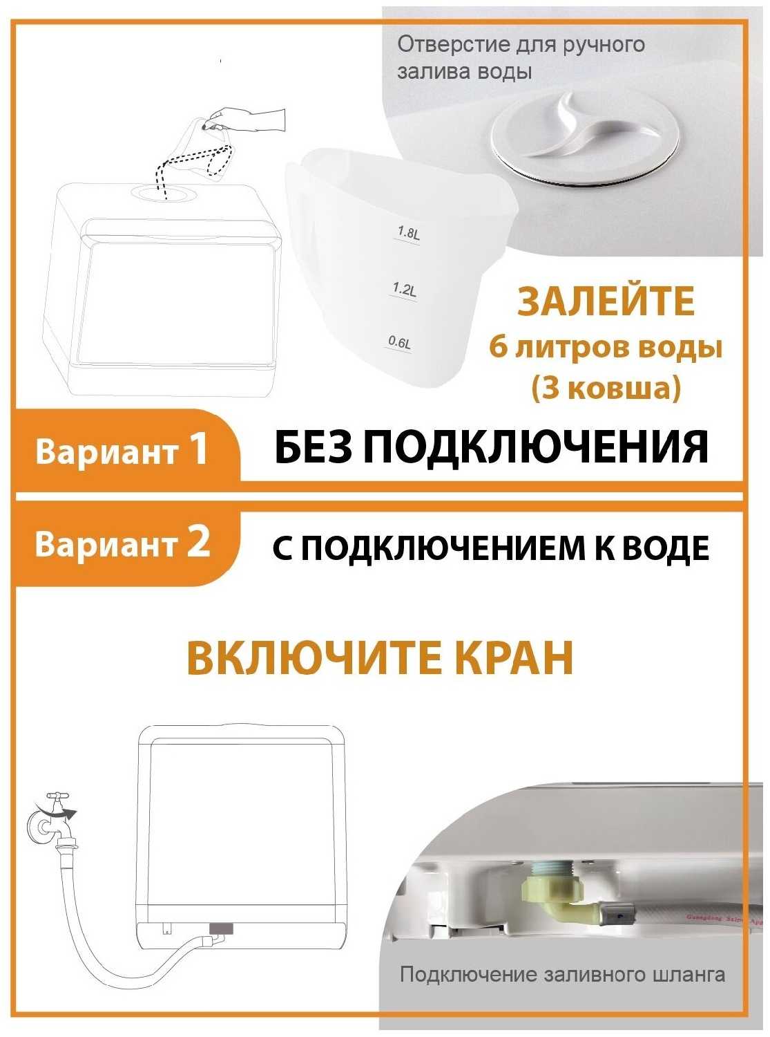 -Предусмотрен залив воды не подключаясь к водопроводу.