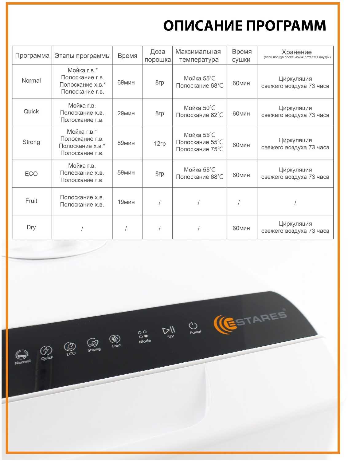 Машина предлагает пять программ мойки: нормальный режим (69 минут), быстрый, эко, усиленный и специальный режим для фруктов. Нормальный режим является наиболее популярным среди пользователей и обеспечивает оптимальное соотношение качества мойки и экономии моющих средств. Режим мойки фруктов оснащен специальной корзиной и успешно справляется с мытьем различных фруктов и овощей, включая клубнику и помело. После завершения цикла мойки машина автоматически активирует режим сушки, который также можно включать отдельно при необходимости. Дополнительно отмечается функция паузы, позволяющая добавить забытые предметы посуды в процессе работы, и система охлаждения посуды после интенсивного нагрева воды.
