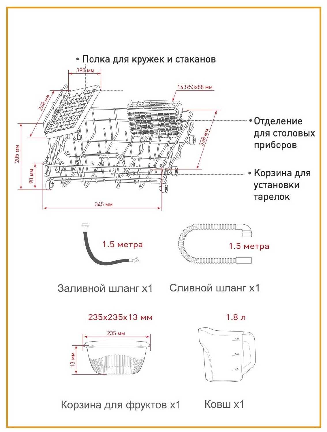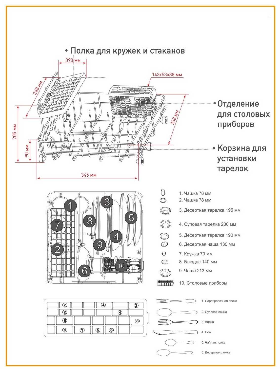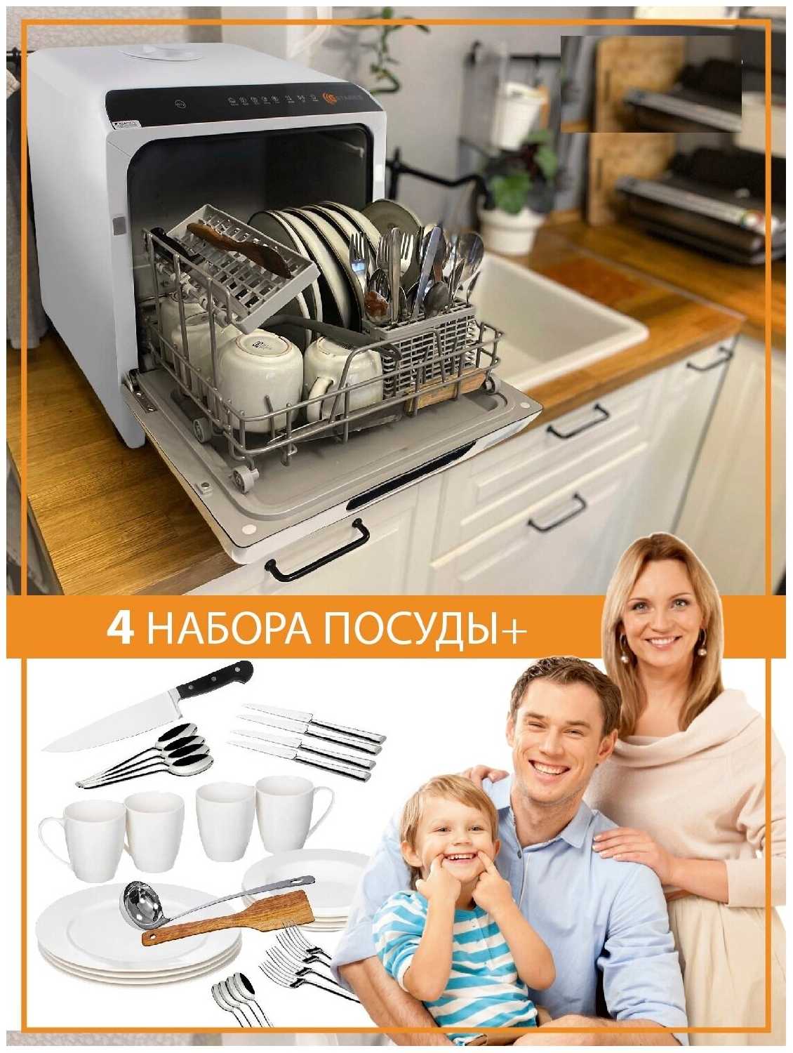 Несмотря на компактные габариты, машина вмещает заявленные 4 комплекта посуды, включая столовые приборы. При грамотном распределении предметов пользователи размещают и дополнительную утварь. Ее размеры часто сравнивают с микроволновой печью, что позволяет легко интегрировать ее в ограниченное пространство кухни рядом с холодильником или на столешнице. -