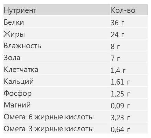Пищевая ценность : | белки 36 %, жиры 24 %, минеральные вещества 7 %, клетчатка пищевая 1, 4 %, омега-6 3, 23 %, омега-3 0, 64 %, кальций 1, 61 %, фосфор 1, 25 %, магний 0, 09 % |
