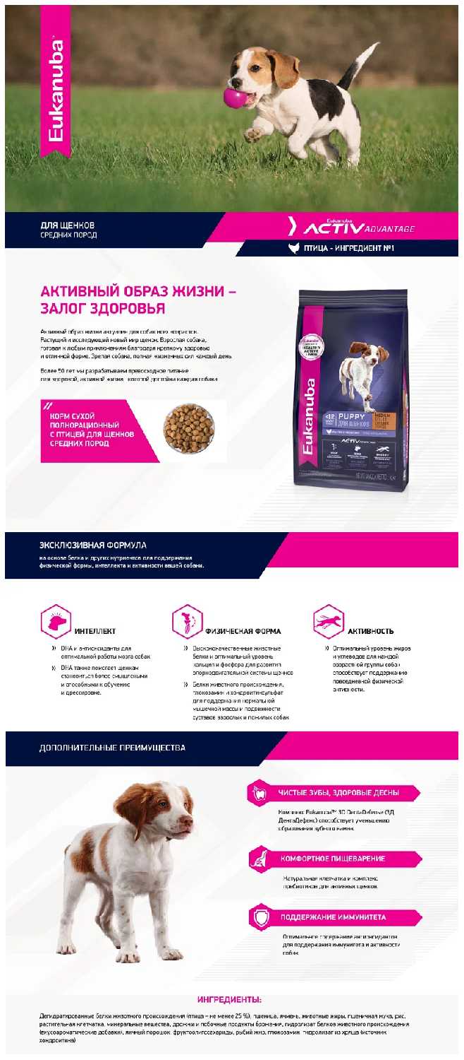 - + состав с животным белком, много всего полезного для роста щенка