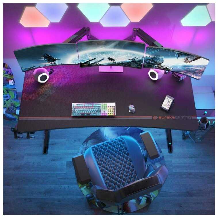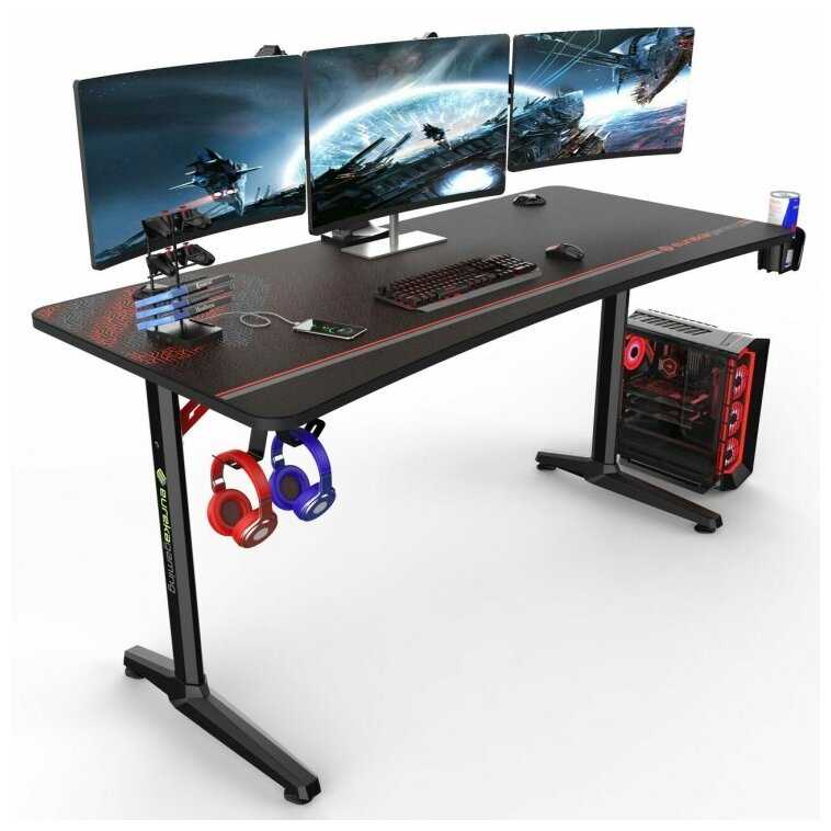 Стол вместительный для двух мониторов, геймпадов и периферии, с USB в подставке для зарядки. Устойчивость не дает тряске передаваться на экраны. Пространство организовано под кабели и аксессуары. Геймеры с симрейсингом отмечают удобство. Для одной большой системы или нескольких экранов — идеально. -