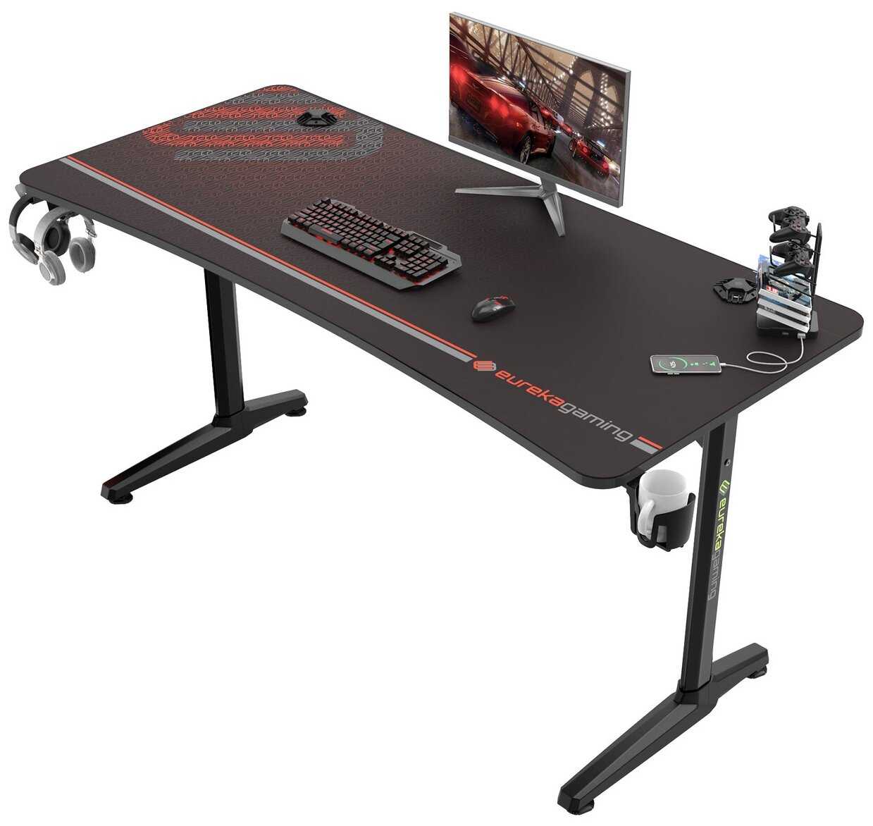 - Подставка под геймпады с USB-разветвителями, крючок для наушников и подстаканник, которые удобны для повседневного использования.