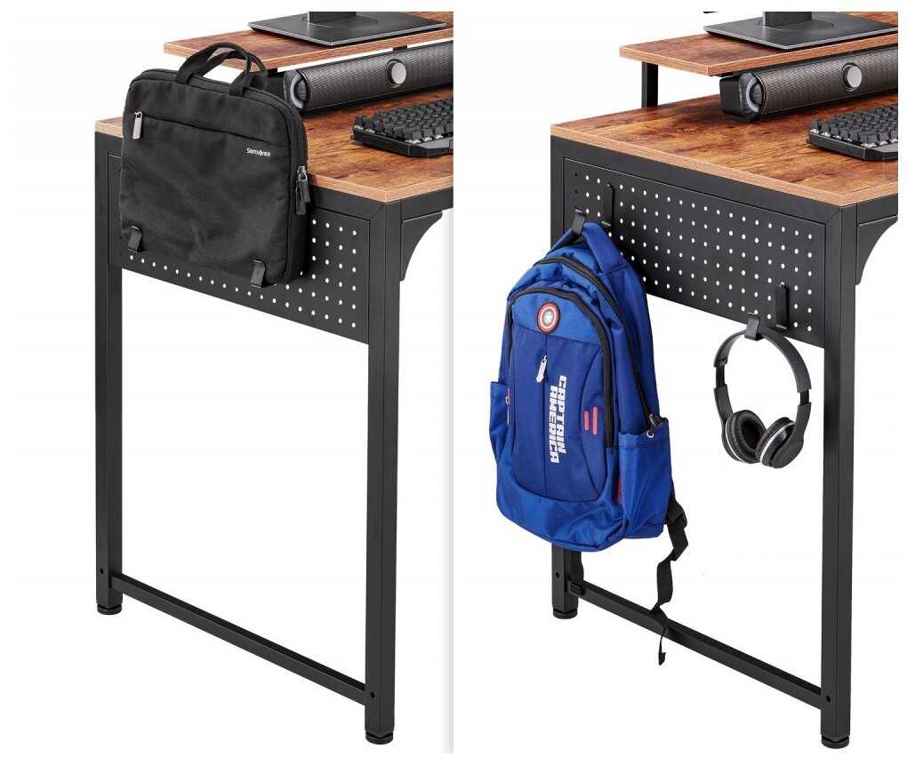 - + Довольно легко собрать, прочный, не шатается, регулируются ножки, подставка под монитор/всякую дичь полезная, за полку под компьютер отдельный плюс, есть крючки чтобы что-то повесить по сторонам стола, сумка с мелкими крючками тоже удобная.