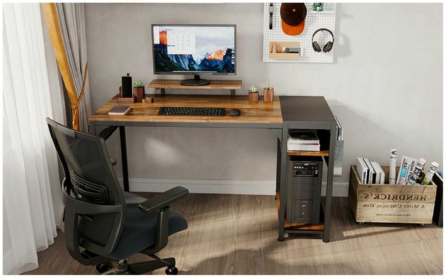 Столешница глубиной от 60 см позволяет разместить клавиатуру с выезжающей подставкой, крупный монитор и периферию. Пользователи отмечают удобство работы даже с бумагами и чертежами. Полка под монитор освобождает дополнительное пространство для книг или декора. -