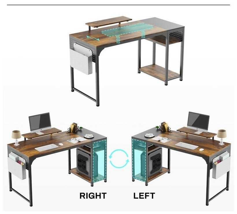 Полку для системного блока или монитора можно монтировать слева или справа благодаря симметричной конструкции. Некоторые переворачивают полку под монитор и размещают ее под столешницей для хранения сетевого фильтра. Важно: регулировка высоты полок не предусмотрена, а крепления некоторых боковых полок — накладные (без болтов). -
