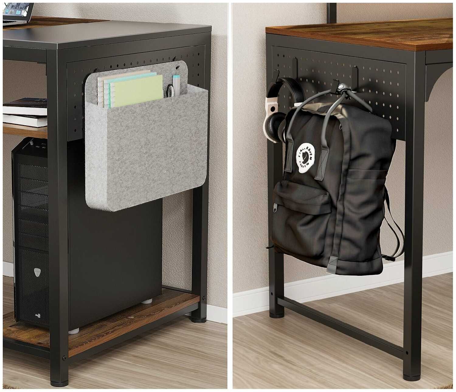 Крючки крепятся на боковины стола и идеально подходят для наушников или кабелей. Тканевая сумка с мелкой перфорацией предназначена для скрытого хранения проводов и роутера — ее можно зафиксировать под столешницей. Пользователи особенно ценят эти аксессуары за организацию пространства, хотя крепление крючков у некоторых моделей требует аккуратности. -