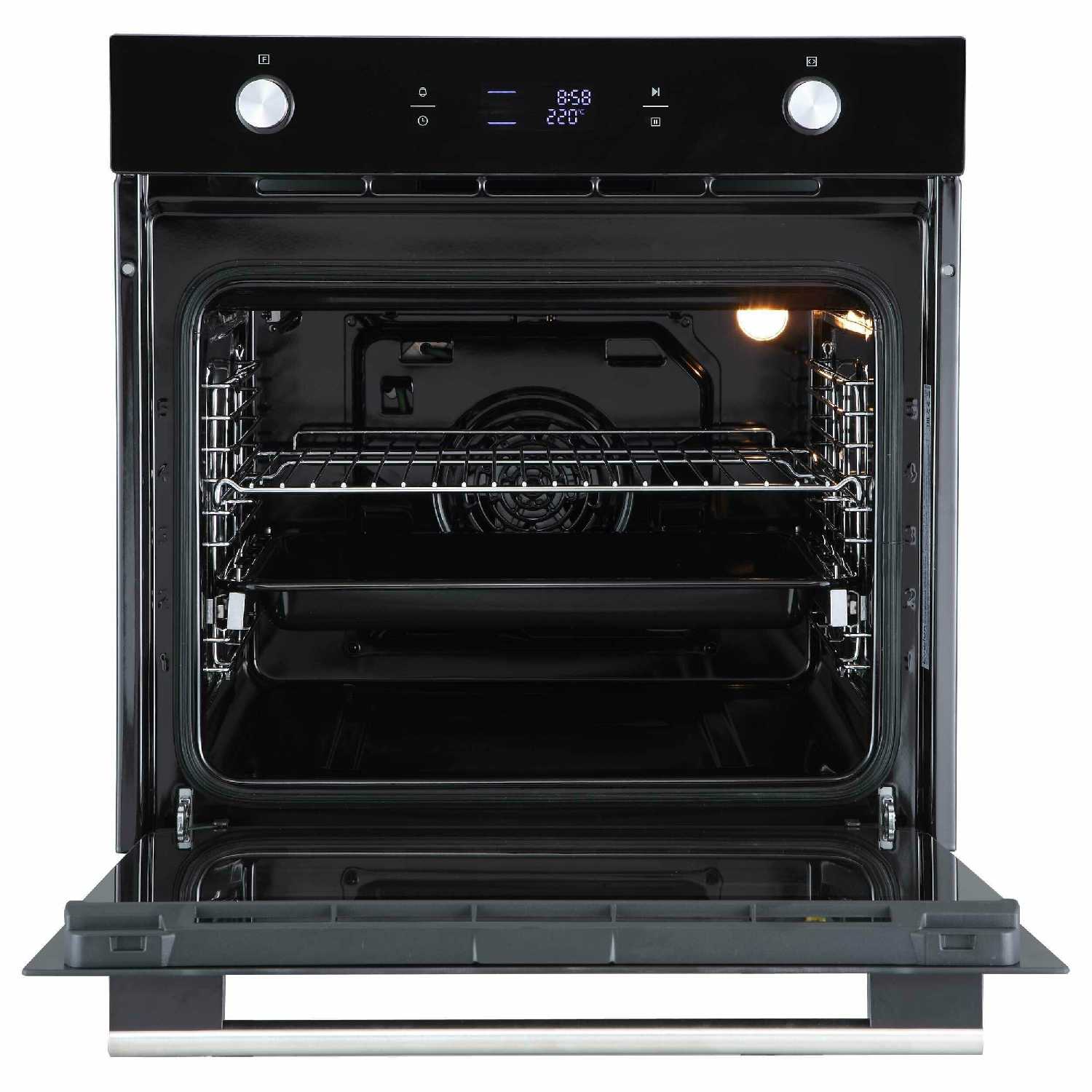 - + Современный духовой шкаф, сенсорная система управления интуитивно проста, срабатывает от легких прикосновений, даже если руки влажные проблем нет.