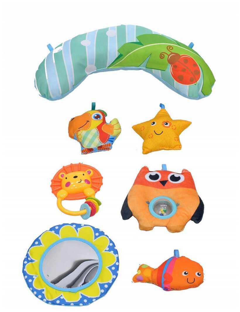 Развивающие элементы : | пищалка, погремушка, зеркало |