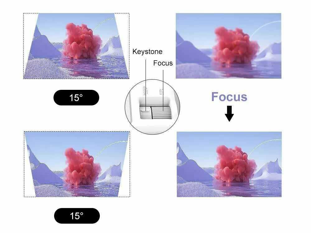 - функции и параметры изображения: коррекция трапецеидальных искажений