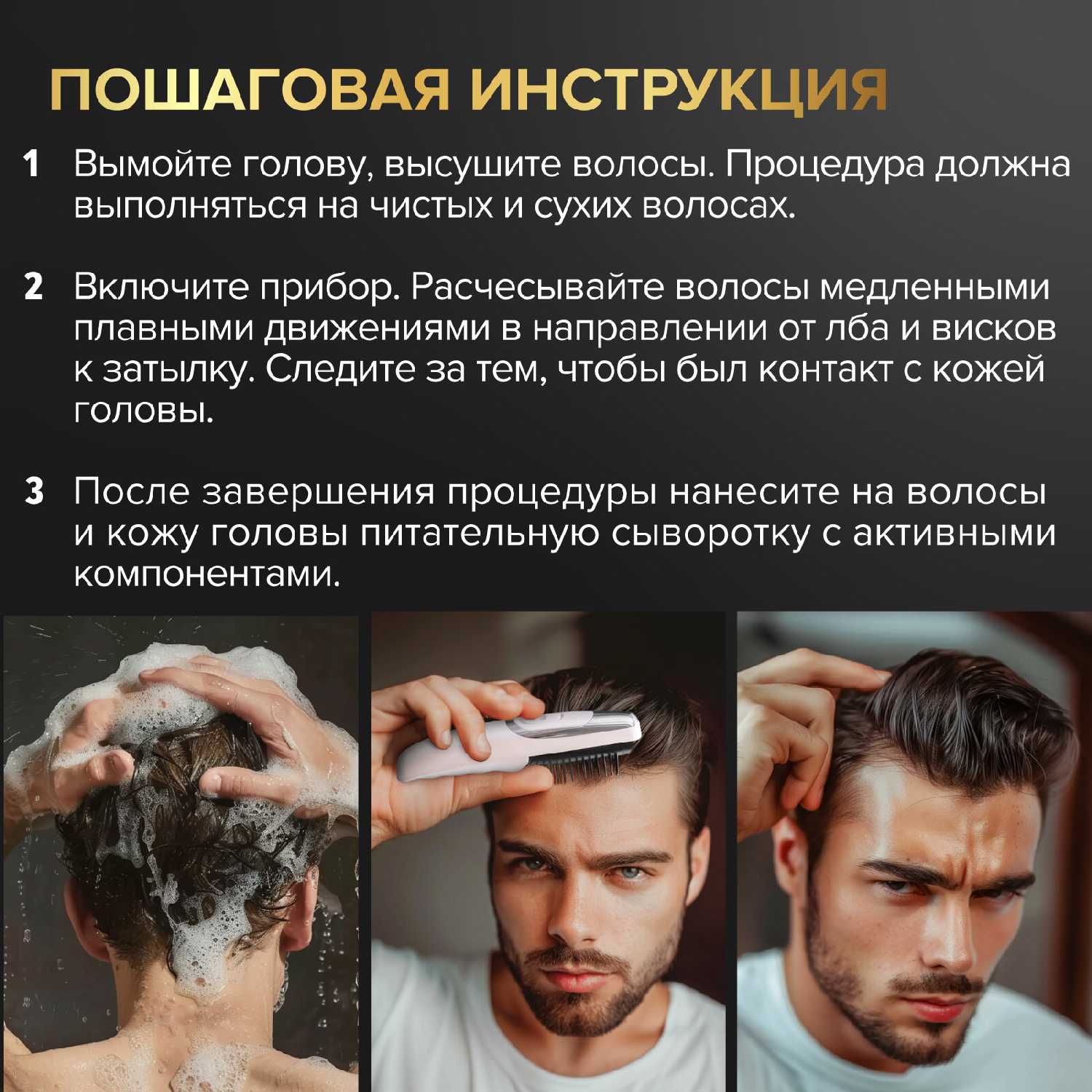 Эффективность для роста волос и борьбы с выпадением: Пользователи подтверждают появление новых волос на залысинах через несколько недель регулярного использования, особенно при комбинировании со специализированными средствами. Уменьшение выпадения волос отмечается в 40% отзывов, при этом результаты проявляются индивидуально: от 2 недель до 2 месяцев. Критичные отзывы (15%) указывают на полное отсутствие эффекта даже после двухмесячного применения по инструкции. Устройство демонстрирует лучшие результаты при возрастном истончении волос, а не при гормональной алопеции. Вибрация и лазерные диоды (длиной волны 650 нм по паспорту) стимулируют фолликулы, что подтверждается видимым "пушком" у лобной линии роста. Для достижения эффекта необходимы ежедневные сеансы по 10-15 минут без пропусков.
