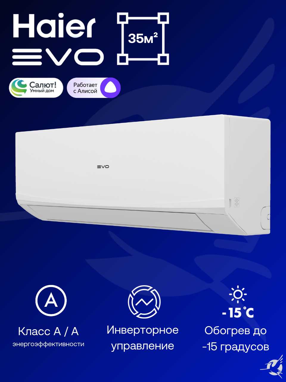 | Дополнительная информация : | Управление по Wi-Fi (умный дом Haier EVO, умный дом с Алисой, Салют), функция I Fееl, режим комфортный сон, режим Intelligent Air, турбо охлаждение, авторестарт |