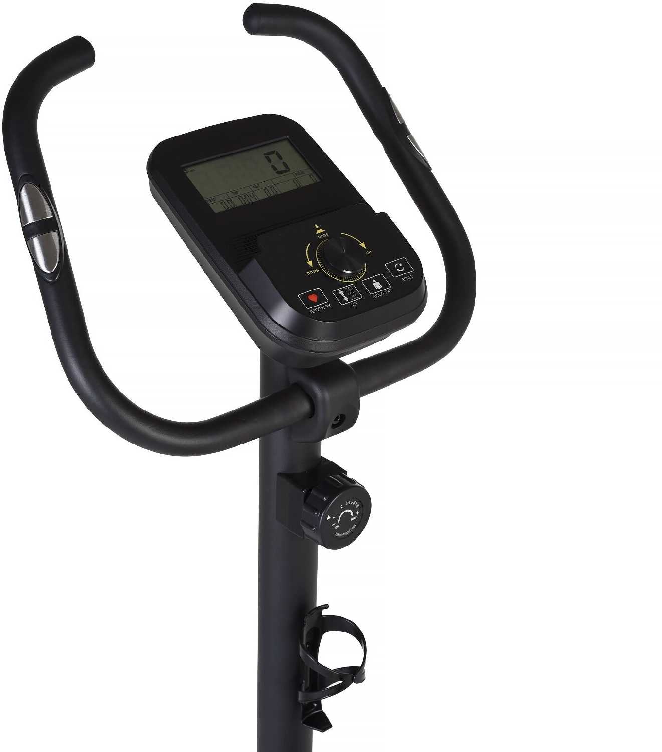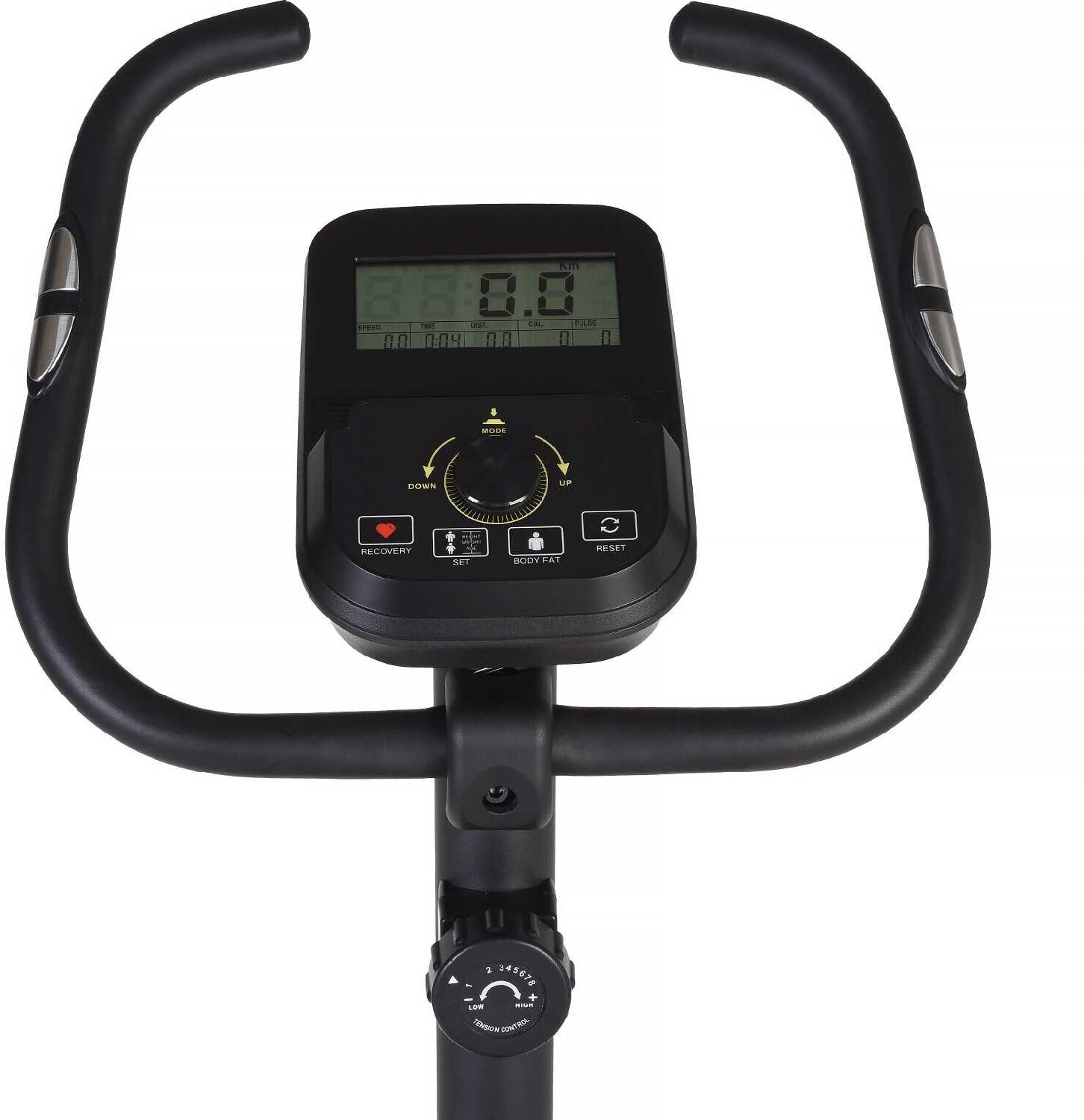 - Дисплей с датчиками пульса на руле отображает скорость, дистанцию, калории и время без подключения к сети.