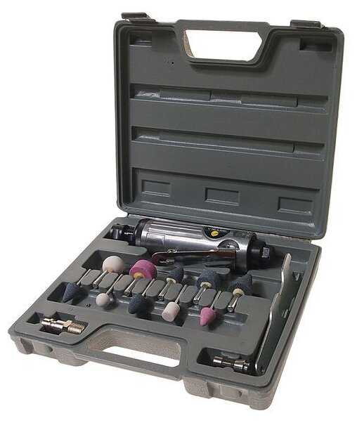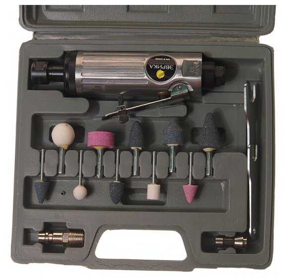 | Комплектация : | Пневмобормашинка ER-81206K (пневмошлифовальная) с набором камней 16 предметов 1/4 22000 об/мин в кейсе ЭВРИКА |