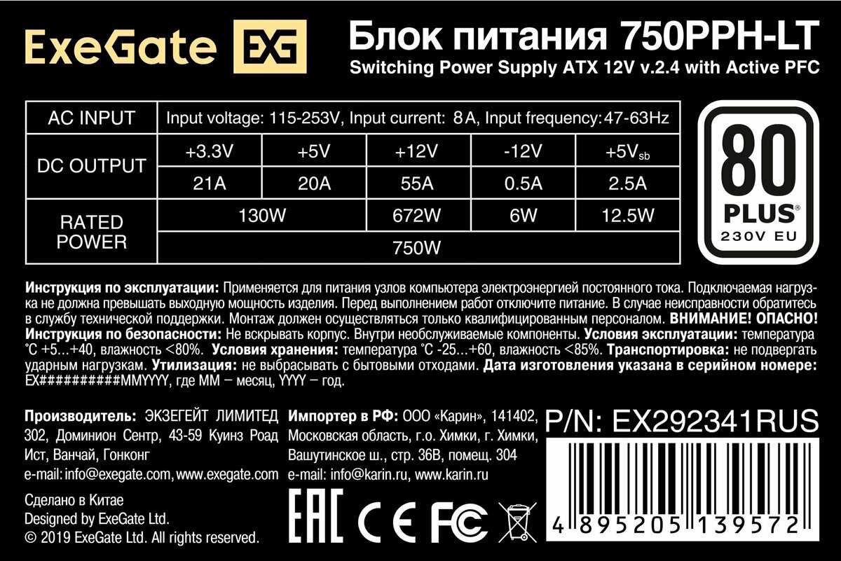 Характеристи ExeGate 750PPH-LT (EX292341RUS)