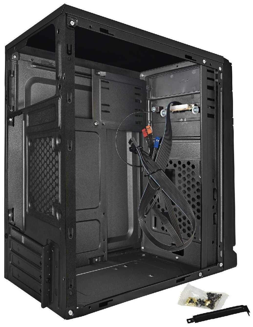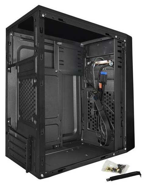 - + Дёшево и сердито. Для нетребовательной сборки.Корпус компактный, внутри есть набор болтиков для крепления материнки и блока питания