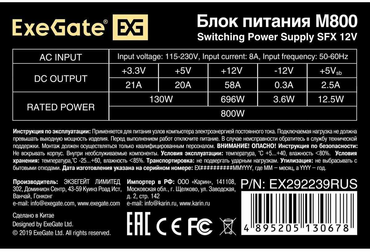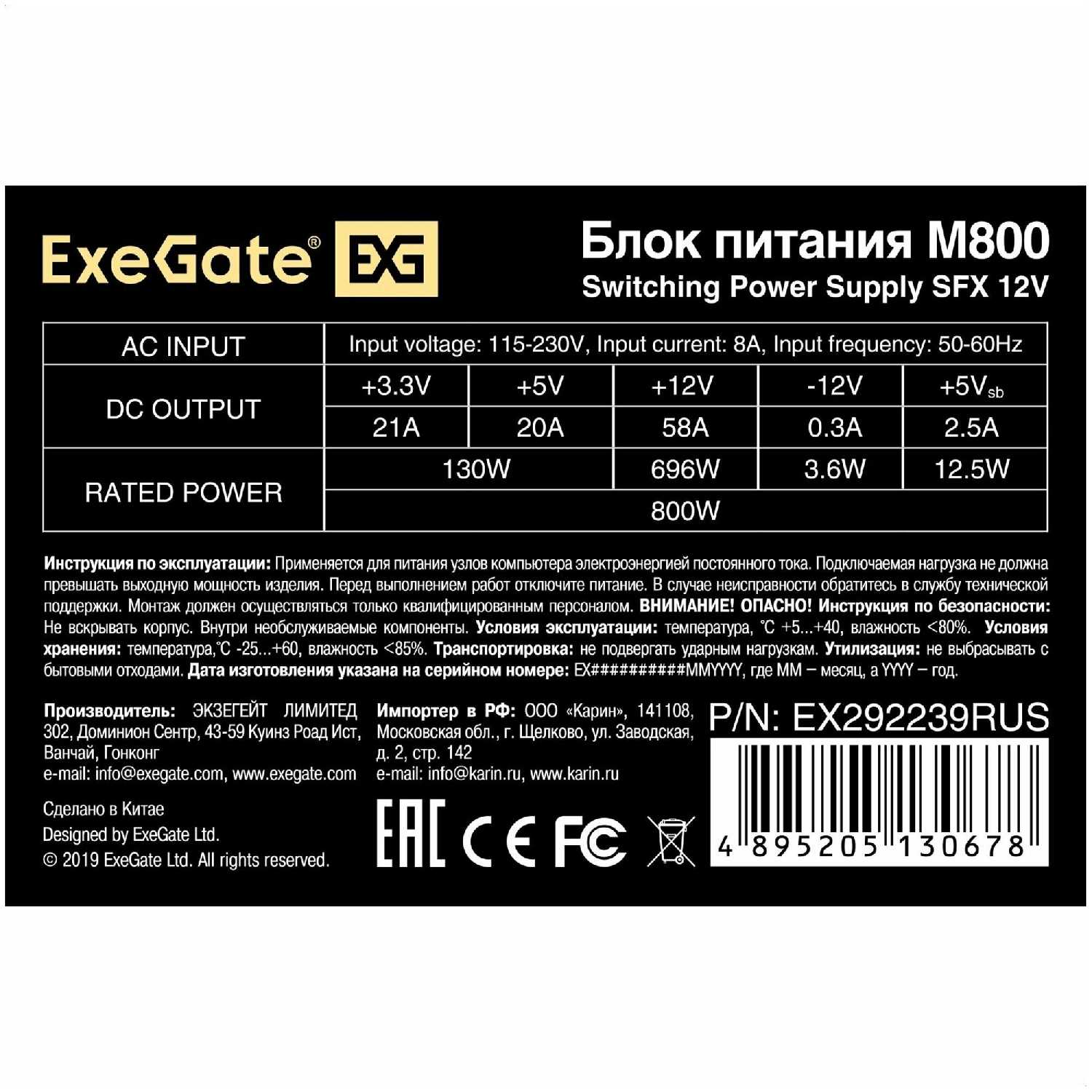 Характеристи ExeGate Блок питания M800 (EX292239RUS)