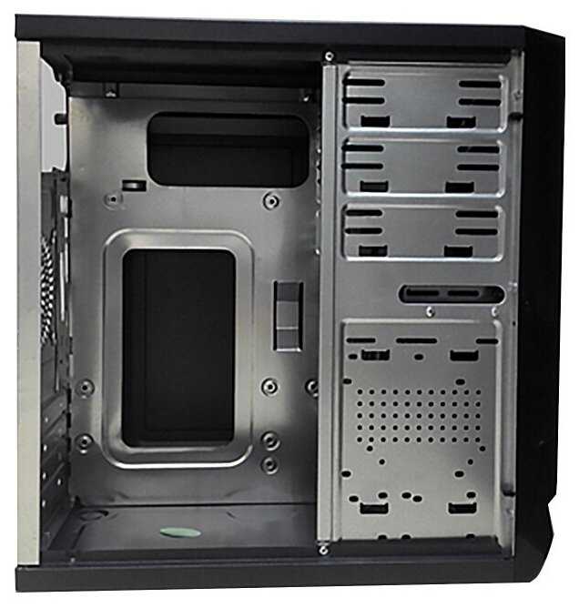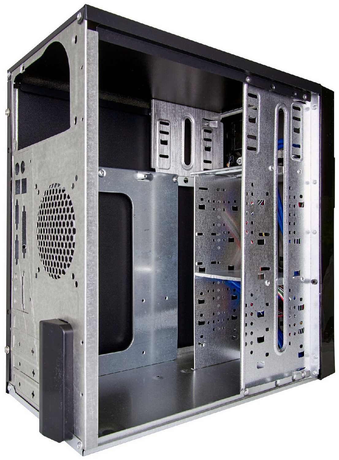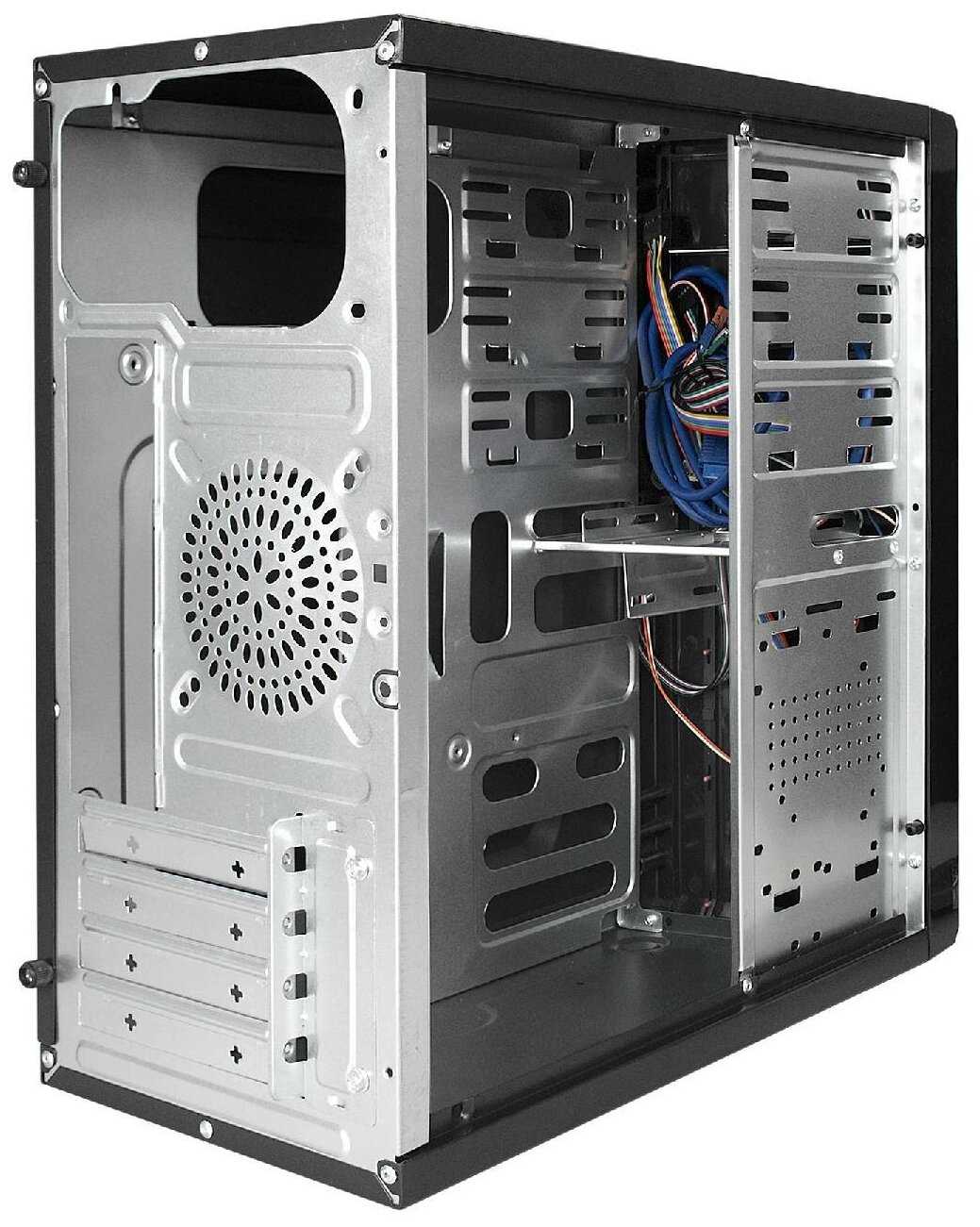 В общем - стандартный корпус. Блок питания не шумный, 350 Вт с огромным запасом хватает на все нужды, если использовать современные процессоры и платы. Вентилятор БП отсасывает воздух изнутри корпуса, продувает через БП и выдувает вовне сзади. Это удачно, поскольку плата обдувается потоками внешнего воздуха, естественно засасываемыми из разных дырок корпуса.