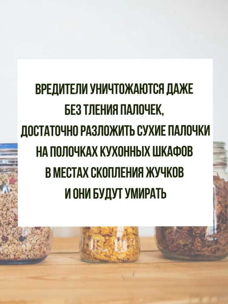Не тратьте деньги, полная чушь, жуки как ползали, так и ползают, даже больше стало, выбросила все зараженные крупы, обработала полки раствором уксуса, зажгла эти палочки, дыма куча, чуть сама не отравилась, а жукам хоть бы что! Их даже больше стало, я положила просто сухую палочку в шкаф, дак эти жуки уже палочку жрут, а не дохнут!