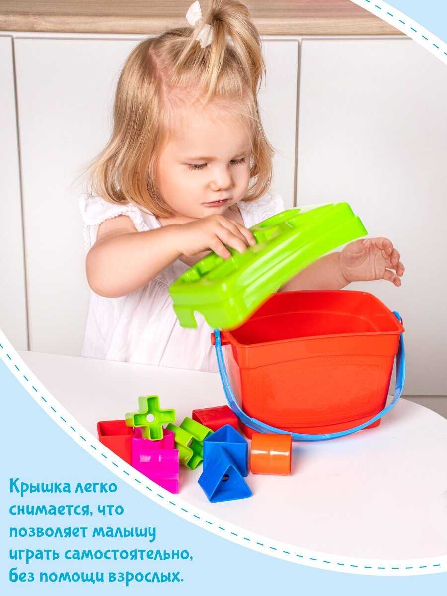 - + хороший сортер, крышка легко открывается и ребёнок сам открывает, когда все фигурки туда положит