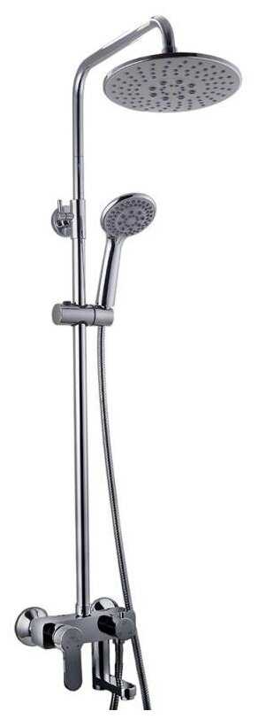 | @Комплектация : | душевая стойка, смеситель, излив, установочный комплект, штанга, верхняя лейка, ручная лейка, шланг |