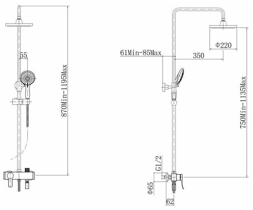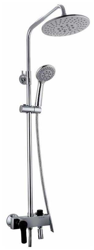| @Комплектация : | душевая стойка, смеситель, излив, установочный комплект, штанга, верхняя лейка, ручная лейка, шланг |