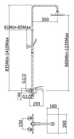 | Комплектация : | верхний душ, душевая стойка, лейка, ручной душ, смеситель, шланг, эксцентрик |