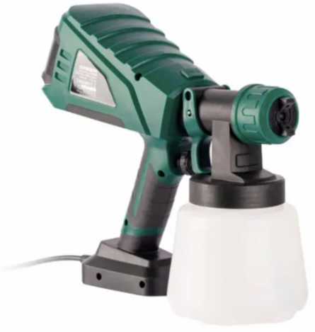 Относительно небольшой и легкий. Удобно держать на весу и можно прокрасить даже проблемные места. Рукоятка местами прорезинена, не скользит в руках. Сопло на распылителе легко и плавно регулируется. На максимальной закрутке больших капель нет. Лучше всего работает с жидкими и полувязкими растворами. Покрасить дома стены, забор или лавочки - это его работа. Кабель коротковатый, нужно брать удлинитель.