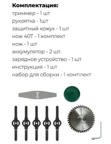 | Подробная комплектация : | триммер, рукоятка, защитный кожух, нож 40T, нож 2T мет. 2шт., нож 2T пласт. 5шт., акумуляторная батарея 2шт., зарядное устройство, руководство по эксплуатации |