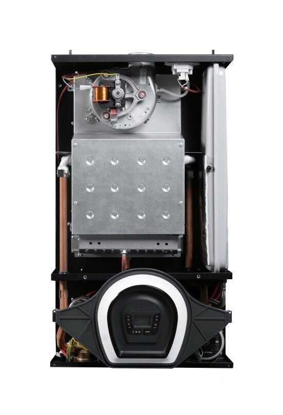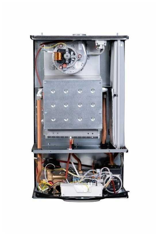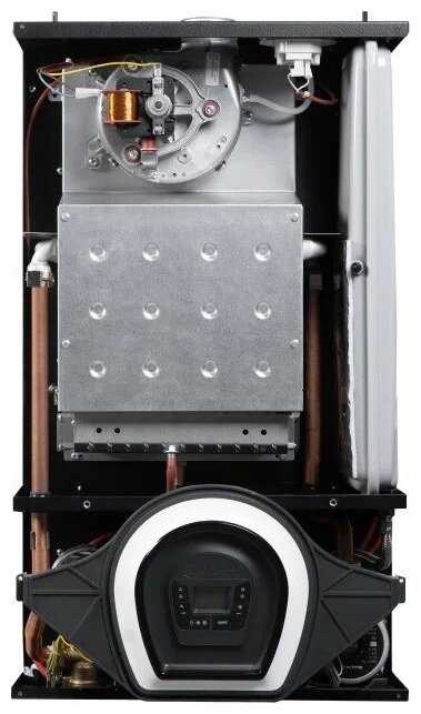 - Медный первичный теплообменник обеспечивает высокий КПД (до 92%) при нагреве отопительного контура.