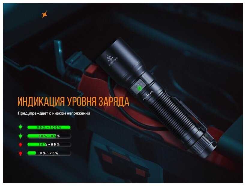 - Индикация заряда на корпусе работает только с родными аккумуляторами Fenix из-за встроенной платы защиты.