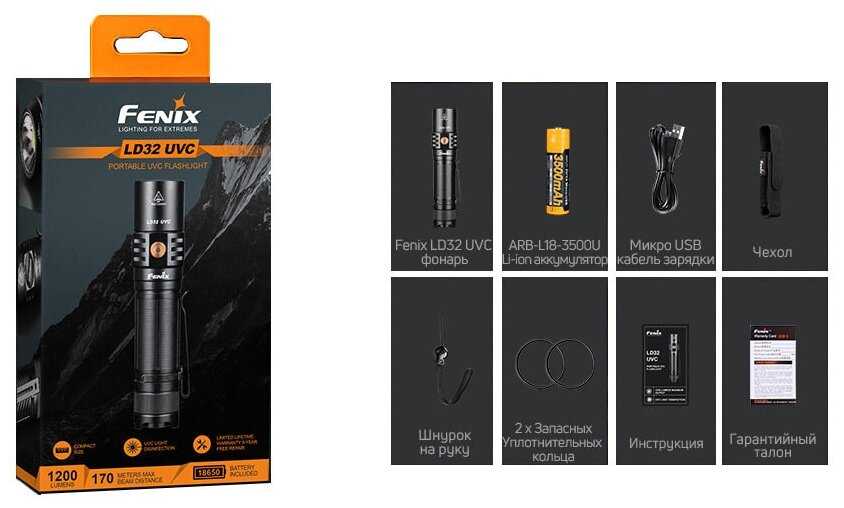 | Дополнительная информация : | УФ режим для дезинфекции, тип аккумулятора: Li-ion, тип батарей: CR123, подробная комплектация: Фонарь Fenix LD32 UVC, количество батарей: 2, количество режимов работы: 5 |