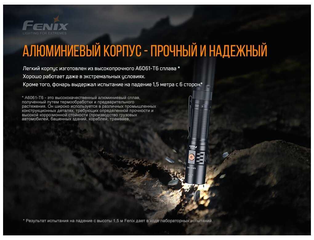 Фонарь великолепен по всем параметрам. Отлично обработанный надежный корпус(он несколько раз падал у меня и все нормально, он превосходно работает). Хороший свет и дальнобойность. Советую приобретать фонари от Fenix, очень хорошее качество- проверено временем.