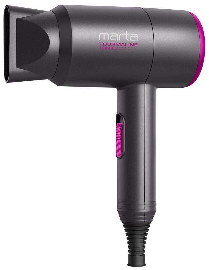 - Фен достаточно компактный. Его очень удобно хранить и брать с собой в путешествия. Быстро сушит волосы, не принося им вред. Есть холодный воздух.